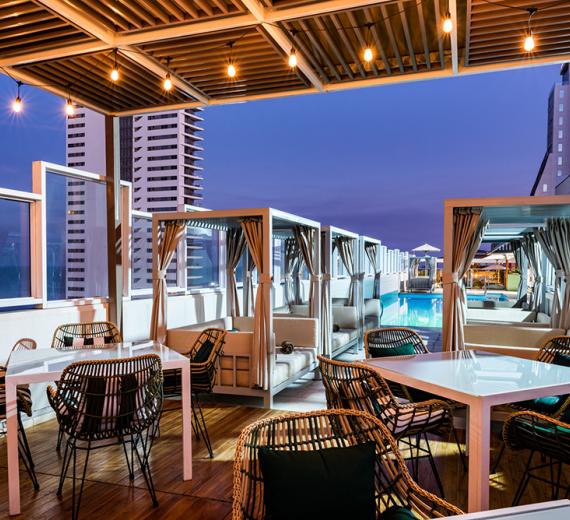 Nuestro Rooftop By Listo, se encuentra en el piso 14 del hotel Holiday Inn Express Cartagena Bocagrande, al lado de nuestra piscina con un ambiente tipo lounge y fresco, donde podrás disfrutar de espectaculares atardeceres, con una variedad gastronómica y bebidas con y sin alcohol, disponible de 10 am hasta las 11 pm todos los dias.