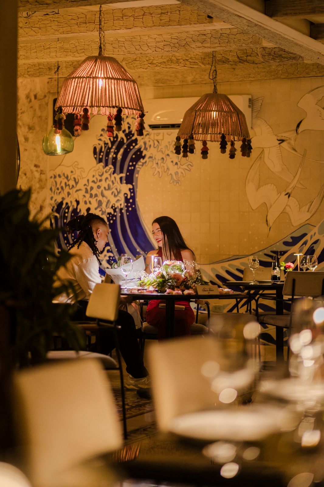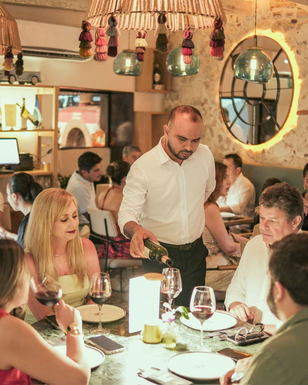 El espacio combina diseño cálido, texturas naturales y una atmósfera sofisticada que evoluciona del almuerzo relajado a una cena vibrante con coctelería y música.